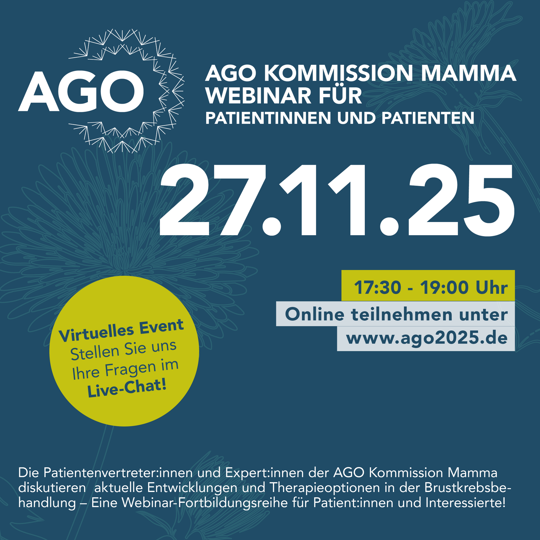 In dieser Webinarreihe diskutieren die Expert:innen der AGO Mamma gemeinsam mit Patientenvertreter:innen relevante Themen und neueste Entwicklungen rund um das Mammakarzinom.