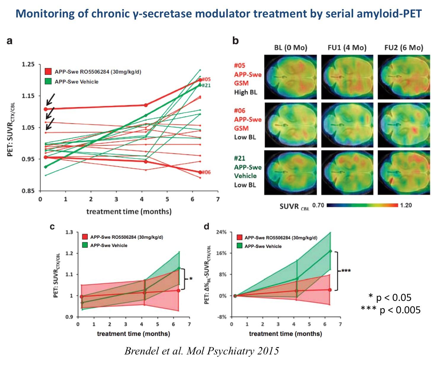 Since imaging can be repeated several times in the same animal, it is possible to measure the time course of the signal over a longer period of time (months) and after interventions in the animal model. These serial measurements provide more stable data than group comparisons, as shown in this example: