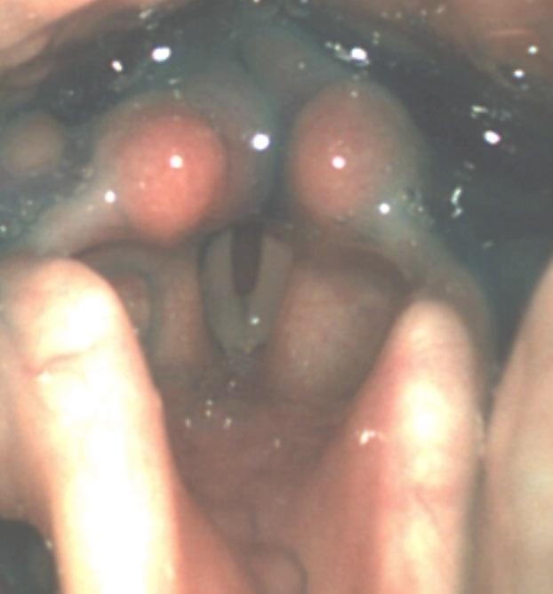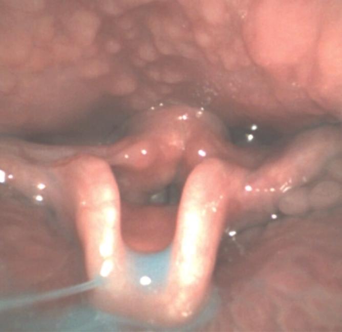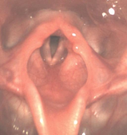 Blick mit dem Endoskop von oben auf den Kehlkopf eines Kleinkindes. Es handelt sich um einen Normalbefund.