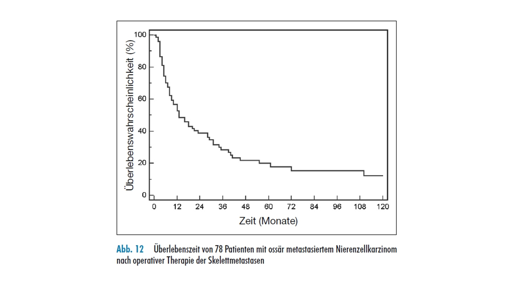 Auch das Nierenzellkarzinom weist eine häufige (ca. 30%) ossäre Metastasierung auf. Gleichzeitig sind Knochenmetastasen des Nierenzellkarzinoms wenig strahlenempfindlich und durch eine Immun- oder Chemotherapie ebenfalls kaum zu beeinflussen. In den letzten Jahren ließen sich allerdings durch die Angiogenese hemmende Präparate eine oft erstaunliche Regredienz viszeraler Metastasen beobachten. Nach intraläsionaler Operation zeigt das Nierenzellkarzinom eine ausgesprochene Neigung zum Lokalrezidiv (Abb. 9). Gerade diese durch ein primär resezierendes Vorgehen vermeidbare Komplikation kann erhebliche Probleme nach sich ziehen (Abb. 10 und 11) und bis zur Amputation führen, insbesondere auch deshalb, da die Patienten vergleichsweise lange überleben (Abb. 12). Dabei zeigte sich zum einen der Metastasierungsstatus, aber auch der zeitliche Abstand zum Primärtumor – je länger der Abstand, desto günstiger – von Bedeutung. Ist ein intraläsionales Vorgehen, z. B. an der Wirbelsäule, unvermeidbar, sollte eine präoperative Embolisation des Tumors erfolgen, da die Metastasen des Nierenzellkarzinoms ausgesprochen gut durchblutet sind. In Einzelfällen kann bei einem primär resezierenden Vorgehen nicht nur das Lokalrezidiv vermieden, sondern der Patient auch eine kurative oder zumindest langjährig tumorfreie Chance erhalten (Abb. 13).