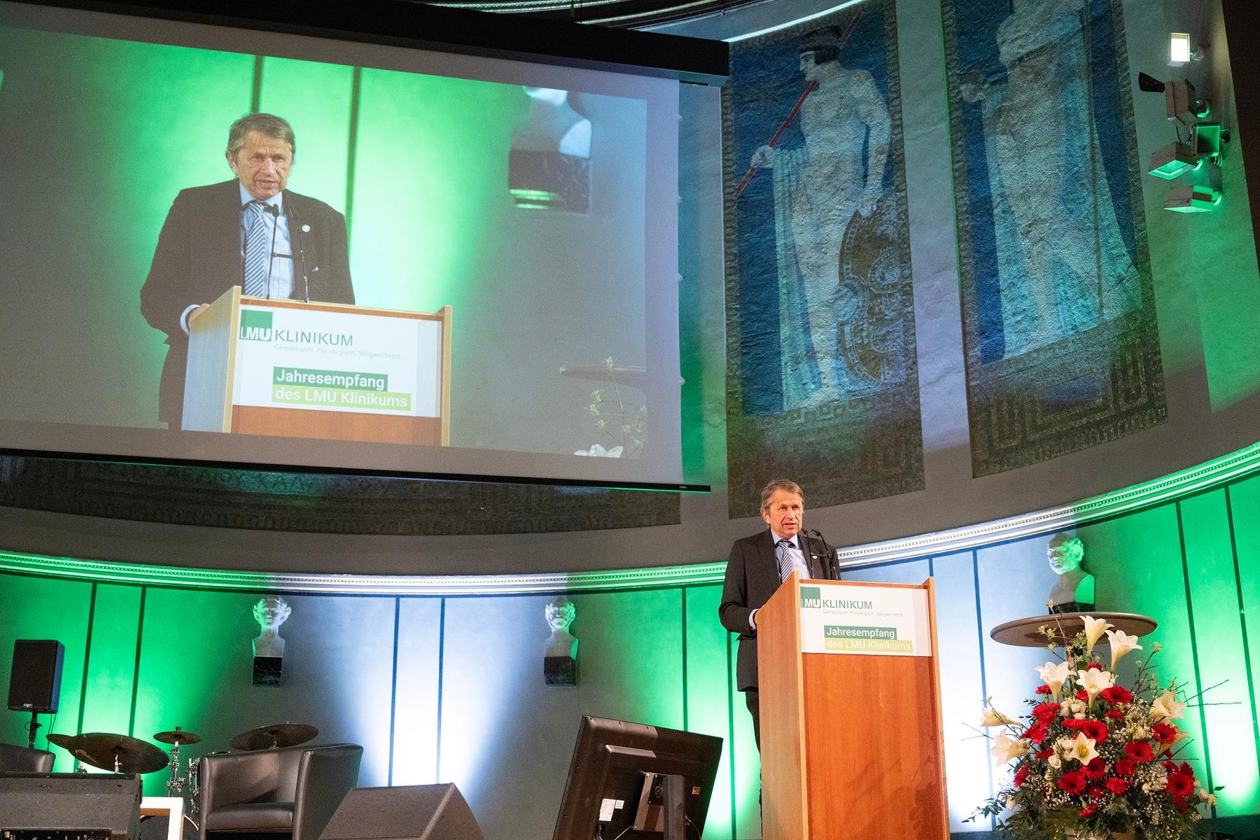 Der scheidende LMU-Präsident Prof. Bernd Huber betonte in seinem Grußwort, welch bemerkenswerte Leistungen das LMU Klinikum im Bereich der Wissenschaft und der Patientenversorgung erbringe. Als aktuelle Highlights nannte er unter anderem die Grundsteinlegung des Neuen Hauner sowie den neuen Forschungsbau ICON. Ein weiterer wichtiger Baustein sei die „M1 – Munich Medicine Alliance“, „mit der wir die Medizin in München insgesamt neu aufstellen wollen“.