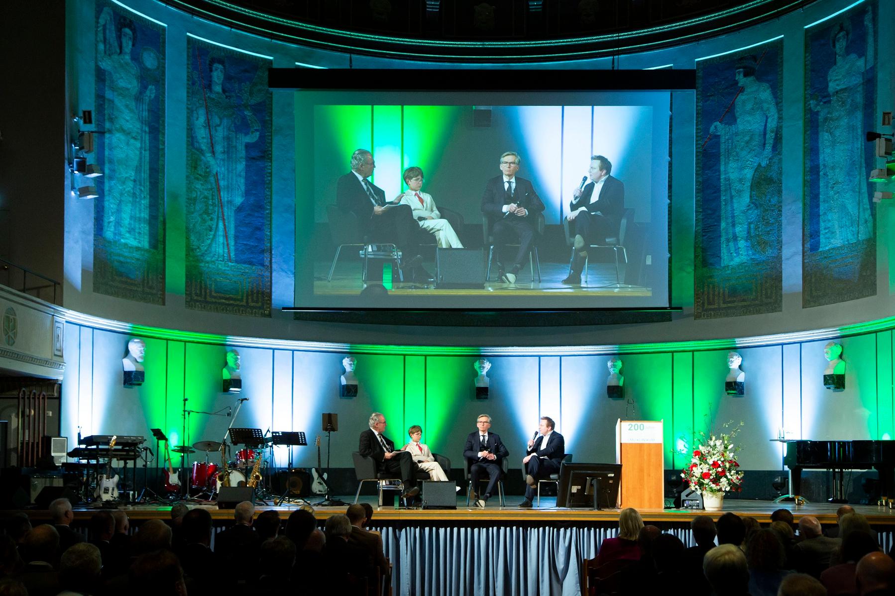 Die Festredner beim Jubiläumsempfang: (v.l.n.r.): Prof. Dr. Matthias Tschöp, Präsident der Ludwig-Maximilians-Universität, Prof. Dr. Markus M. Lerch, Ärztlicher Direktor und Vorstandsvorsitzender des LMU Klinikums, Dr. Markus Söder, Bayerischer Ministerpräsident und Markus Blume, Bayerischer Staatsminister für Wissenschaft und Kunst.