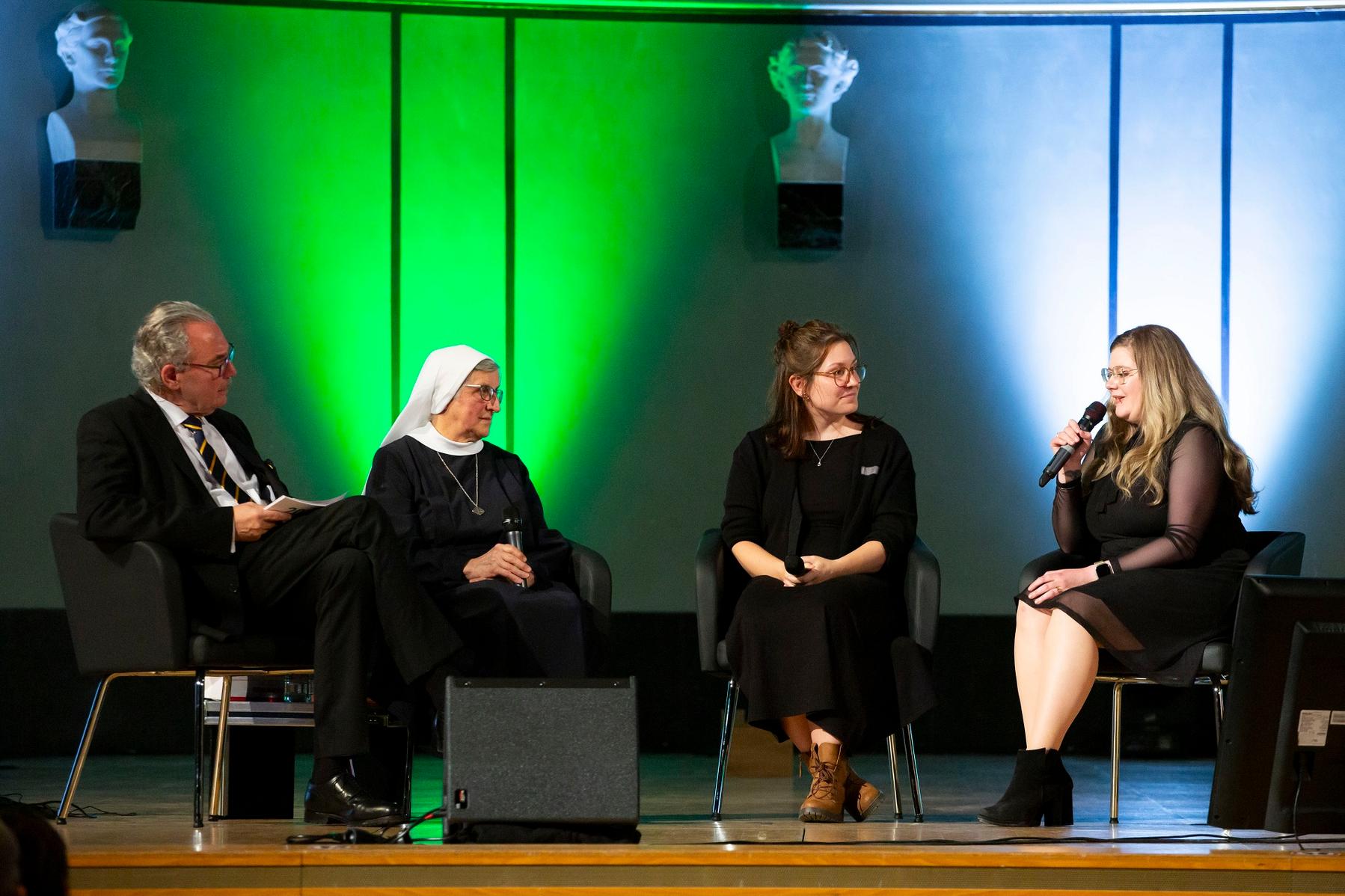 Generaloberin Rosa Maria Dick vom Orden der Barmherzigen Schwestern und die beiden Palliativpflegerinnen, Pflege-Influencerinnen (Instagram-Kanal: @elsa.palliative.care) und Bestseller-Autorinnen vom LMU Klinikum, Michaela Bayer und Sara Loy, erläuterten die vielfältigen Facetten der Pflege anschaulich. Heute gilt die generalistische Pflegeausbildung als Standard: eine dreijährige Fachkraftausbildung, die Theorie und Praxis in verschiedenen Versorgungsbereichen verbindet und mit einer staatlichen Abschlussprüfung abschließt. Weiterführende Studiengänge tragen dem wachsenden Bedarf an hochschulisch qualifizierten Pflegefachpersonen Rechnung – denn der medizinische und technologische Fortschritt stellt auch die Pflege vor immer anspruchsvollere Aufgaben.