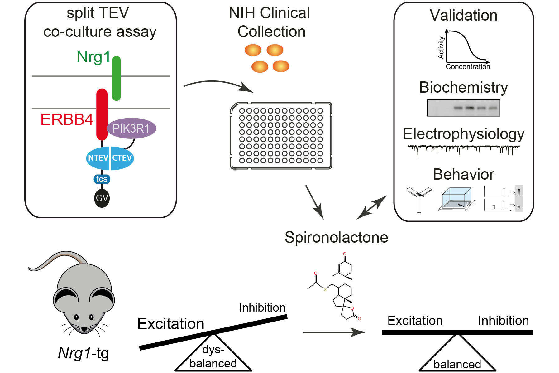 Increased neuregulin-1 (NRG1)‐ERBB4 signalling is associated with schizophrenia, and corresponding mouse models display endophenotypes of the disease. Recently, we performed a drug repositioning screen using a cell-based split TEV assay to screen for modulators of the Nrg1-ERBB4 signalling pathway (Wehr et al., 2017). Spironolactone was identified in the screen as a substance that could inhibit NRG1‐ERBB4 signalling; in subsequent pre-clinical studies it was found to improve schizophrenia‐relevant phenotypes in NRG1‐transgenic mice (Figure 3). Based on these promising pre-clinical results and the fact that spironolactone is a licensed and thus safe drug, colleagues initiated a three-arm clinical trial of spironolactone as an add-on medication in schizophrenia (Hasan et al., 2020). In summary, the outcome of this approach indicates that combining cell-based assays with drug repositioning screenings can shorten drug discovery in comparison with standard approaches and may identify promising therapeutic options for psychiatric diseases.