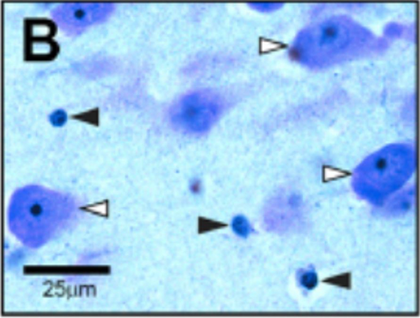 Figure 1A, B: A. Delineation of hippocampal subregions Dentate Gyrus (DG) and Cornu Ammonis (CA) regions in human brain B. Cresyl-violet and luxol fast blue staining in CA4. White arrowheads indicate neurons, black arrowheads point to oligodendrocytes.