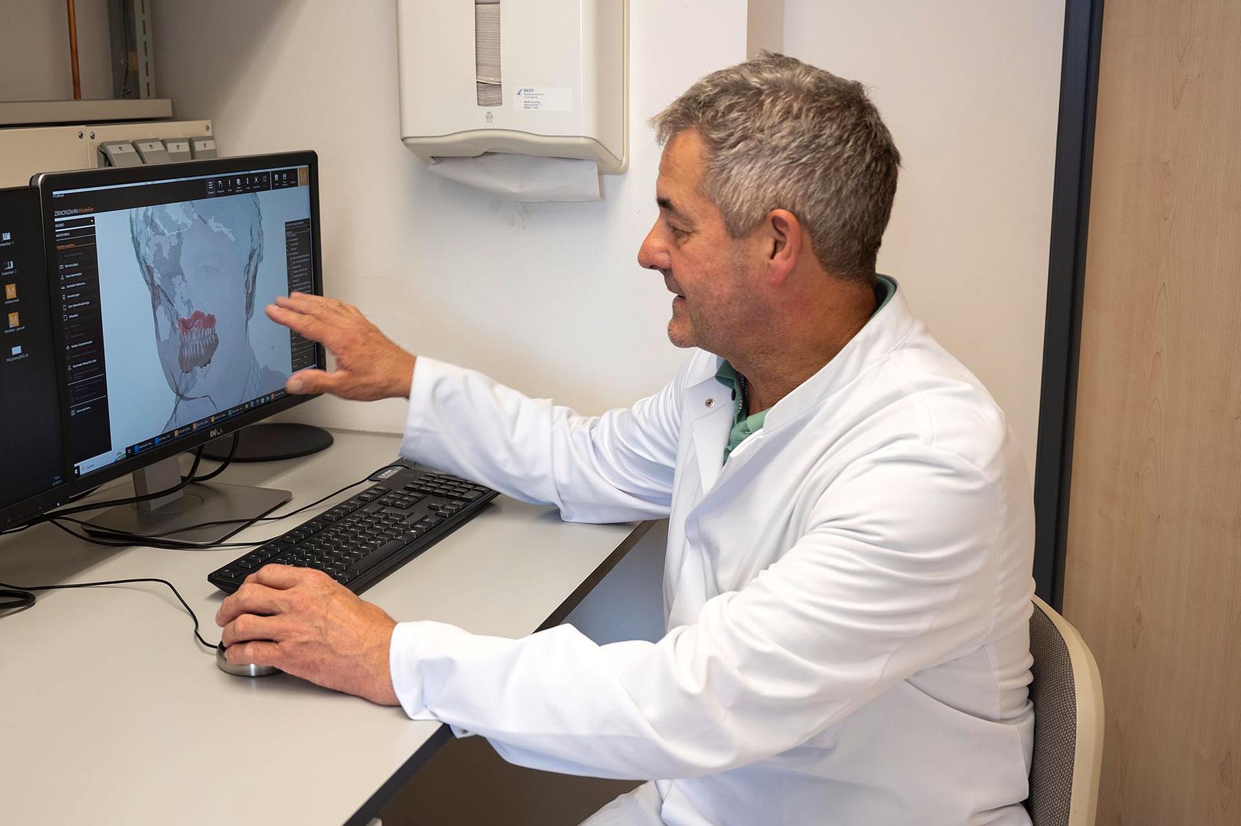 Gerade bei komplexeren Zahnproblemen ist die interdisziplinäre Zusammenarbeit zwischen den einzelnen Kliniken unabdingbar. So arbeiten unter anderem die Poliklinik für Kieferorthopädie und die Klinik für Mund-, Kiefer- und Gesichtschirurgie in den Spezialsprechstunden zu Kieferfehlstellungen und Lippen-Kiefer-Gaumenspalten eng zusammen. Bei schwerwiegenden Kieferfehlstellungen wie einem Fehlbiss (Dysgnathie) ist zum Beispiel oft nicht nur eine kieferorthopädische Behandlung, sondern auch ein chirurgischer Eingriff, eine Osteotomie des Kiefers, nötig. Die Behandlungen werden seit einigen Jahren routinemäßig mit digitalen 3D-Planungen statt wie bisher am Gipsmodell geplant. Durch die Simulation der Operation können anatomische Besonderheiten und mögliche individuelle Risiken frühzeitig erkannt und berücksichtigt werden. Insgesamt ist die Operationszeit so kürzer, der Eingriff genauer und das Behandlungsergebnis gut voraussagbar.