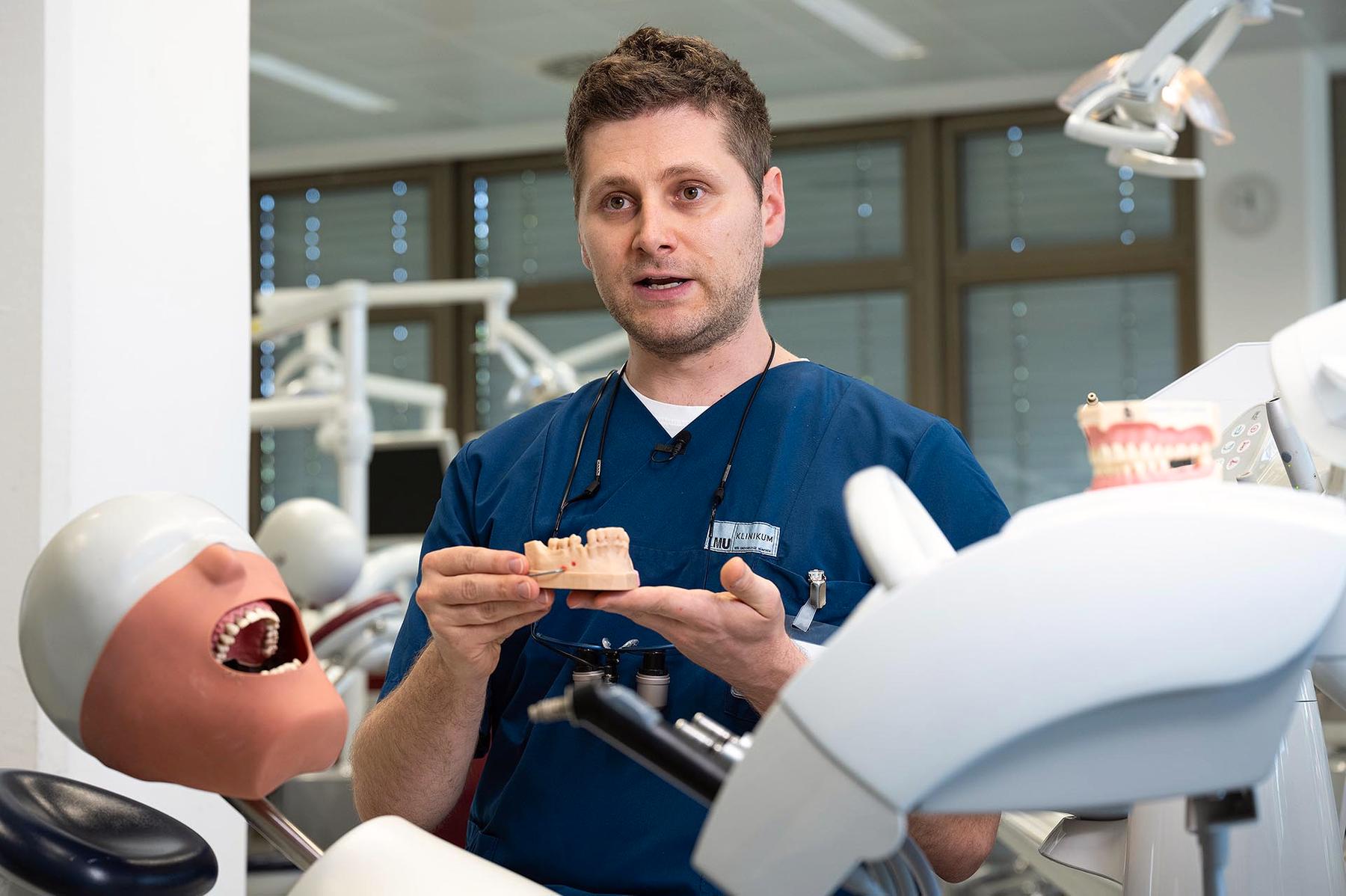 Heute bilden die Zahn-Mund-Kiefer-Kliniken und ihre Lehrstühle jährlich mehr als 130 Studierende aus – und ist damit die größte Ausbildungsstätte der Zahnmedizin in Deutschland. Da das Zahnmedizin-Studium sehr praxisorientiert ist, sind die Studierenden fest in den Klinikenalltag integriert, zum Beispiel in der Ambulanz der Poliklinik für Zahnerhaltung und Parodontologie: Dort arbeiten die Studierenden ab dem siebten Semester – unter Aufsicht von Fachärzten – direkt an Patient:innen. Zur Vorbereitung kommen in den sogenannten Phantomkursen modernste Techniken zum Einsatz: Dank 3D-Druck ist es möglich, die CT-Aufnahmen von komplexeren klinischen Fälle, zum Beispiel von Traumata, von Parodontitis oder Wurzelbehandlungen, detailgenau auszudrucken. So können die Studierenden an „echten“ Fällen üben, bevor sie die ersten Patientenbehandlungen übernehmen.