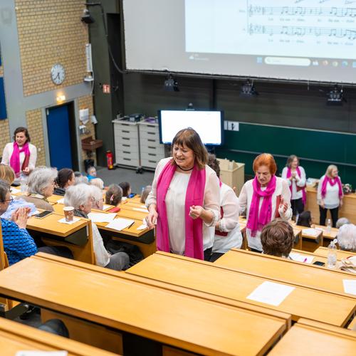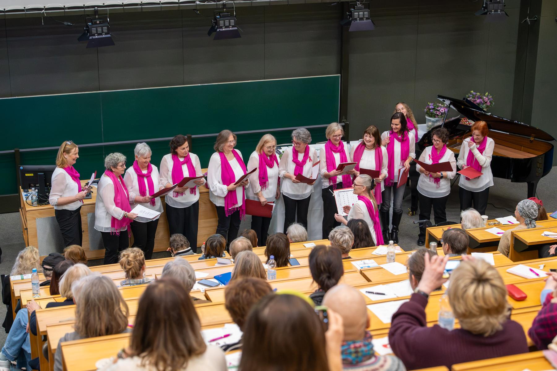 Und genau diese Idee wollen wir bei unseren PatientInnen und Ihren Familien unterstützen. Über 350 TeilnehmerInnen haben sich vorort informiert, in der großen Ausstellung, am Informationsstand des Brustzentrums und von Brustkrebs Deutschland e.V, bei den ReferentInnen direkt und im großen Hörsaal zu den Themen frühes wie metastasiertes Mammakarzinom und antihormonelle Therapie, aber auch zu zwei Vorträgen mit geballten Informationen und Aktiveinheiten zu den Themen Fatigue ( E. Jentschke) und Bewegung (P. Thaller und T. Degenhardt). Zusammen mit den Pinkt Voices wurde auch gesungen. Die Fragerunden boten die Möglichkeit, nachzuhaken und gezielte Antworten von den Expertenpanels zu bekommen.
