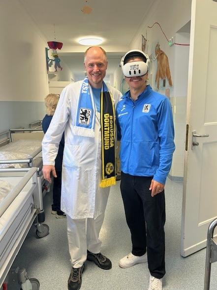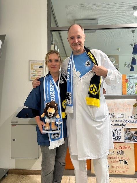 Es war wieder so weit. Ein Team des TSV 1860 München war bei uns zu Besuch, um Kinder, Eltern und Mitarbeiter zu erfreuen. Auch unser geschäftsführender Oberarzt war wieder begeistert, schlägt in seiner Brust doch neben dem Herz für den TSV das Herz für den BVB.