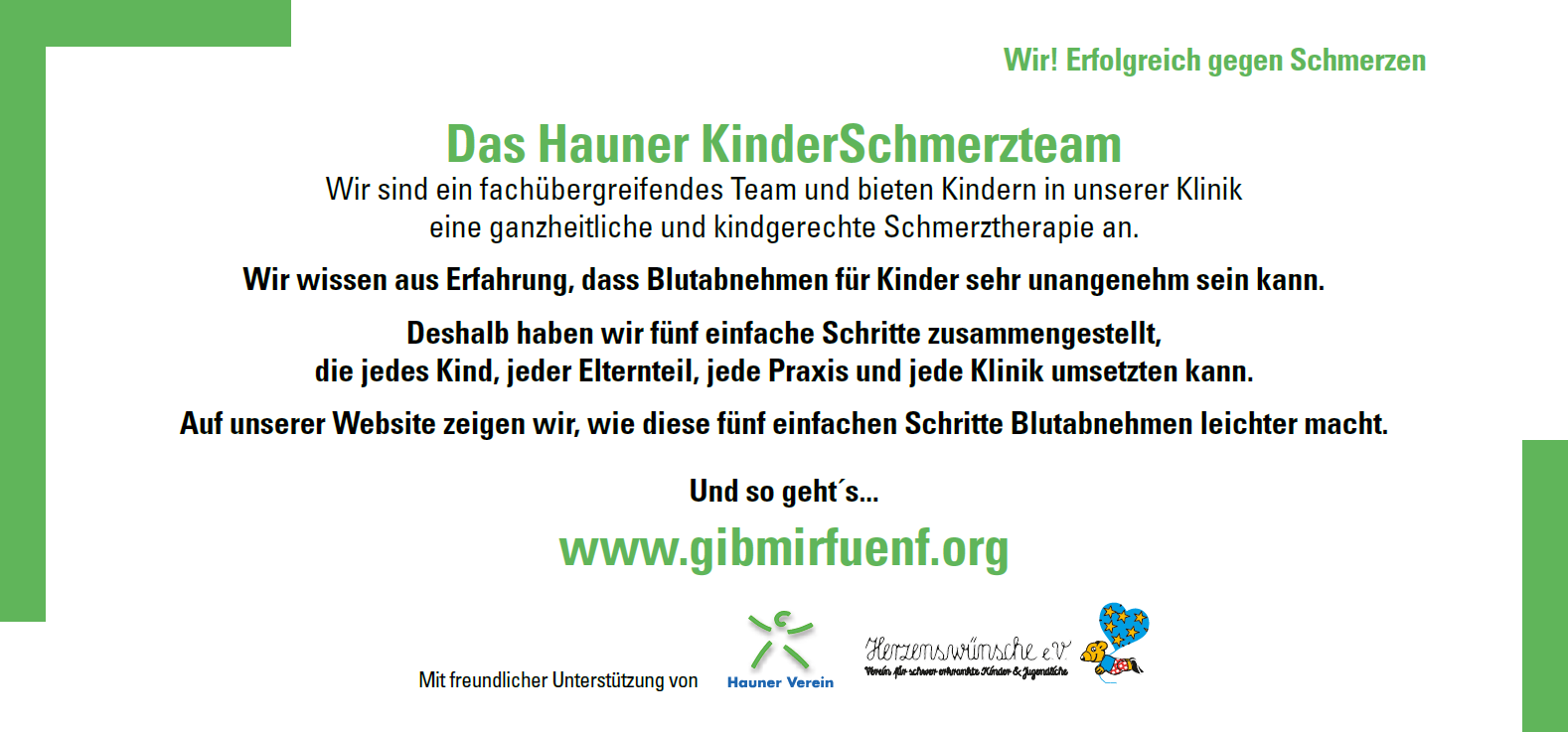 Um eine möglichst schmerz- und damit auch stressfreie Behandlung unserer Kinder sicherzustellen, hat das interdisziplinäre Hauner-Kinder-Schmerz-Team, das seit Frühjahr 2019 über eine Drittmittelfinanzierung des Hauner-Vereins zur Verfügung steht, in enger Vernetzung mit allen behandelnden Abteilungen und auf Basis der aktuellen wissenschaftlichen Erkenntnisse bereits gut etablierte Standards weiterentwickelt und in die tägliche Routine integriert mit dem Ziel einer ganzheitlichen Schmerztherapie.