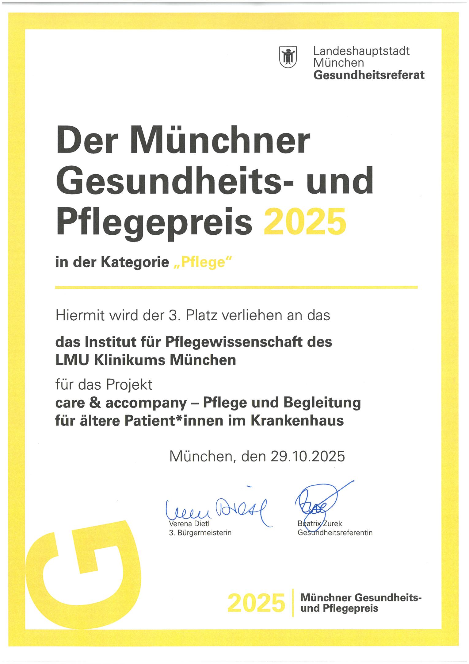 Der Münchner Pflegepreis wird alle zwei Jahre vom Gesundheitsreferat der Landeshauptstadt München verliehen und zeichnet innovative Projekte aus, die einen herausragenden Beitrag zur Weiterentwicklung der Pflegepraxis leisten.