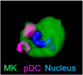 A significant focus of our research group is the study of immunothrombosis, particularly the mechanisms regulating platelet biogenesis in the bone marrow and their implications in thrombo-inflammatory diseases. In this context, we recently discovered a key regulatory mechanism of megakaryopoiesis, where plasmacytoid dendritic cells release interferon-alpha, influencing platelet production. This groundbreaking discovery, published in Nature 5 (2024), was made possible using IVM, highlighting the power of this technology in uncovering cellular interactions in vivo. Understanding this mechanism provides new insights into the role of immune regulation in platelet formation and its potential contributions to immunothrombotic events.