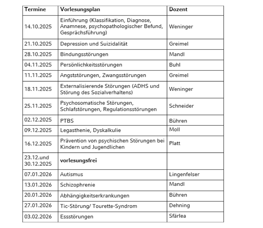 Vorlesung Kinder- und Jugendpsychiatrie und Psychotherapie