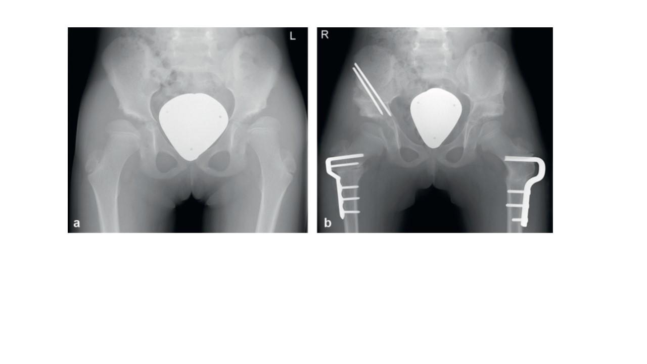 (a) zeigt einen 9-jährigen Patienten mit beidseitiger Minderüberdachung des Hüftkopfes und Steilstellung der Schenkelhälse. (b) zeigt den Zustand nach beidseitiger Beckenosteotomie nach Salter und Umstellungsosteotomie am proximalen Femur. Da der Eingriff in zwei Etappen erfolgte (zunächst auf der linken Patientenseite und dann rechts) sind rechts noch Salter-Stäbe einliegend. Zum Vergrößern auf das Bild klicken.