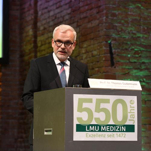 Mit 2.000 Betten und rund 11.500 Mitarbeitenden in ca. 50 Fachkliniken, Instituten und Abteilungen ist das LMU Klinikum heute das zweitgrößte Klinikum Deutschlands. Pro Jahr werden dort ambulant und stationär 500.000 Patienten versorgt. Die Medizinische Fakultät bildet bundesweit die meisten Medizinstudierenden aus, derzeit sind es rund 6.000. „Beste Köpfe, gute Strukturen, starke Verbünde – das ist das Motto, das wir versuchen, in der täglichen Arbeit umzusetzen“, sagte Prof. Dr. Thomas Gudermann, Dekan der Medizinischen Fakultät in seinem Festvortrag „Die LMU Medizin: Gestern, Heute, Morgen”. „Wir sind die einzige Fakultät in Deutschland, die in allen acht Deutschen Zentren der Gesundheitsforschung vertreten und damit in der Breite der medizinischen Exzellenz einzigartig ist.“ Dazu kommen sechs Sonderforschungsbereiche der Deutschen Forschungsgemeinschaft, in denen die LMU als Sprecher auftritt. Als führende vollständige Fakultät könne die Medizinische Fakultät der LMU junge angehende Ärztinnen und Ärzte vom ersten bis zum letzten Studiensemester in allen Disziplinen auf dem aktuellen Stand des Wissens und höchstem Niveau ausbilden, so Gudermann. Hervorzuheben ist neben dem Nachwuchsförderprogramm „Munich Clinician Scientist Program“, das Forschung und Patientenversorgung eng verzahnt, auch das Medizinische Curriculum München (MeCum), das auf dem Konzept des problemorientierten Lernens der Harvard Medical School basiert.