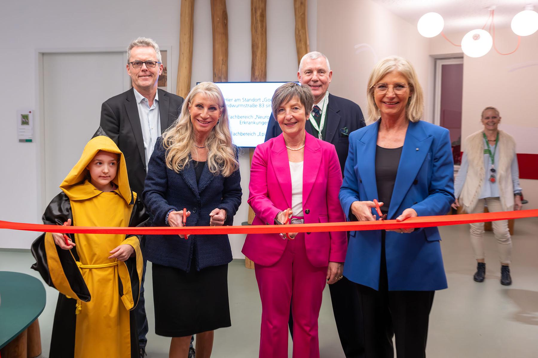 Sie schnitten symbolisch das Band zur Eröffnung der neuen Räume des iSPZ durch: das Münchner Kindl, Schirmherrin Karin Baumüller-Söder, LVKM-Vorstandsvorsitzende Konstanze Riedmüller und Bayerns Sozialministerin Ulrike Scharf